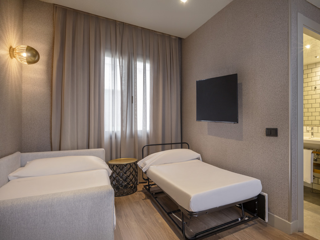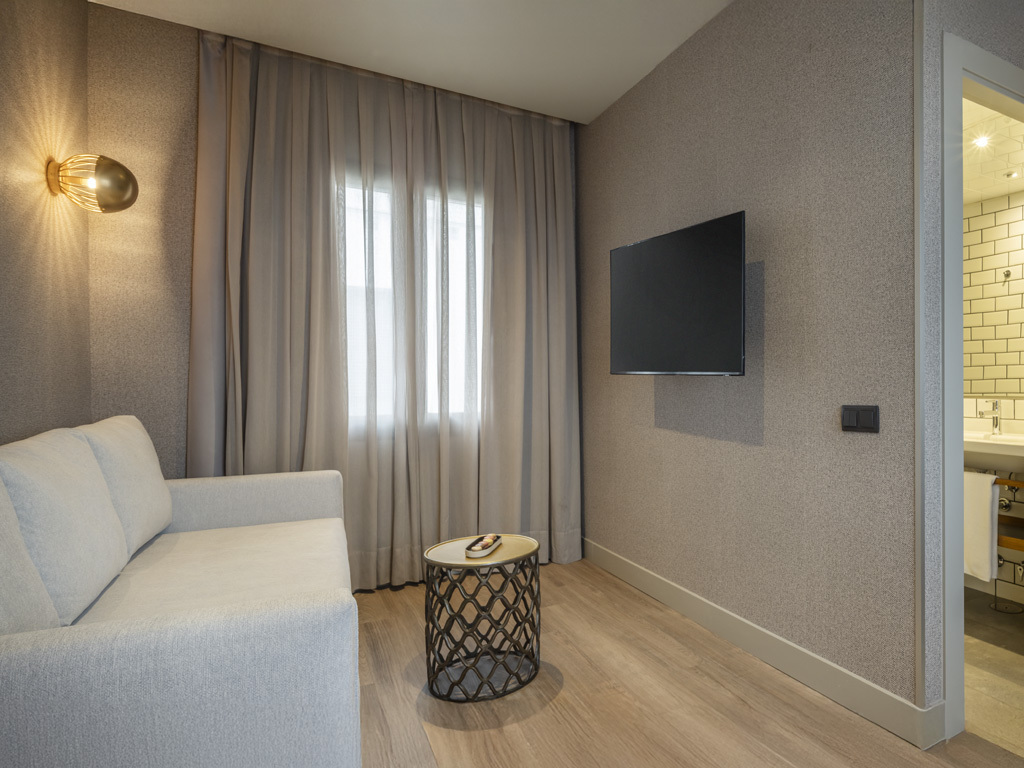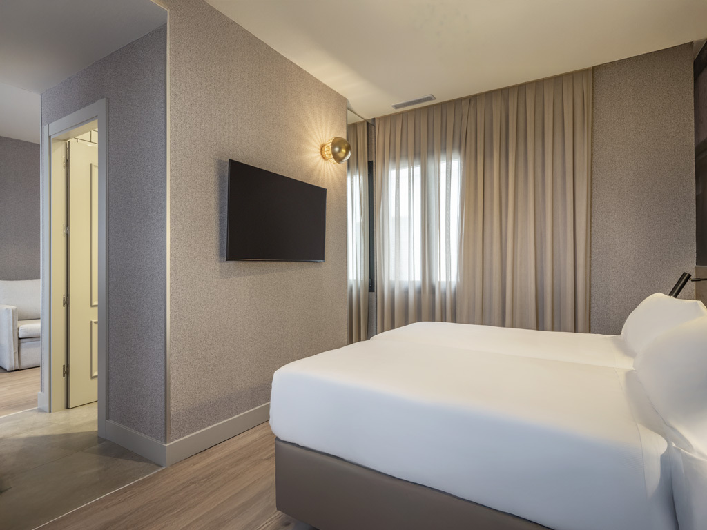 Habitaciones tipo suite con capacidad para hasta 4 personas, con sala independiente donde se ubica un sofá cama y una 2ª televisión. (smart TV) Esta habitación incluye tetera (kettle) microondas y nevera y baño completo privado con bañera o ducha y secador de pelo. Camas: dos juntas + sofá cama/supletoria o cama de matrimonio + sofá cama/supletoria Capacidad: 4 personas. Tamaño de la habitación: 35 m²